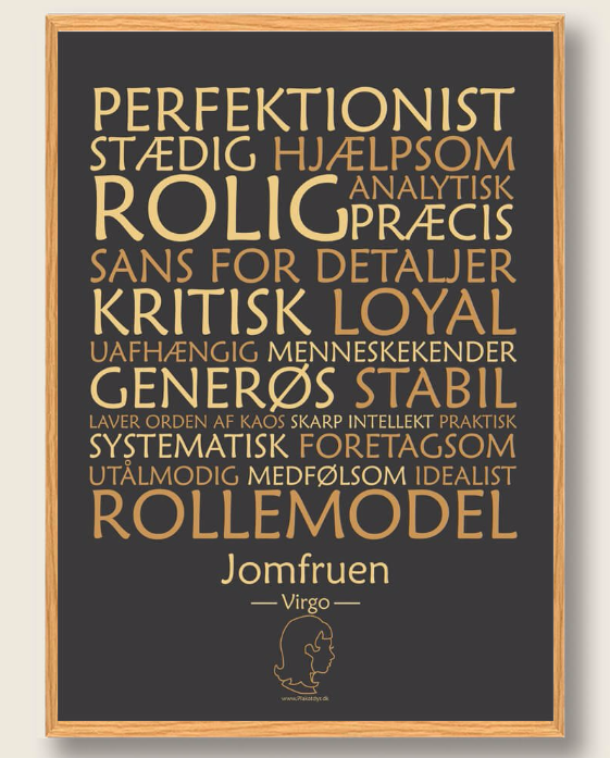 Vi har fundet Stjernetegn Jomfruen Sort – Plakat fra Plakatdyr.dk hos Plakatdyr.dk i kategorien Stjernetegn Plakater. Stjernetegn jomfruen (24. aug. – 23. sep.) Hjælpsom, praktisk samt analytisk. Det er blot nogle af de egenskaber, som siges at karakterisere de personer, som er født i jomfruens tegn. Kan du nikke genkendende til dem? Eller kender du måske nogen, som pas